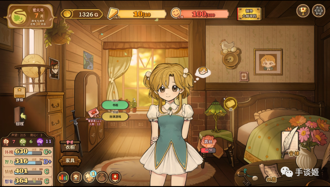 从游戏开始就可以看到左上角的回合数倒计时,等到倒计时结束,时间线又会推进一段时间,并以女儿寄信回来的形式告诉玩家女儿职业和情感等方面的结局。