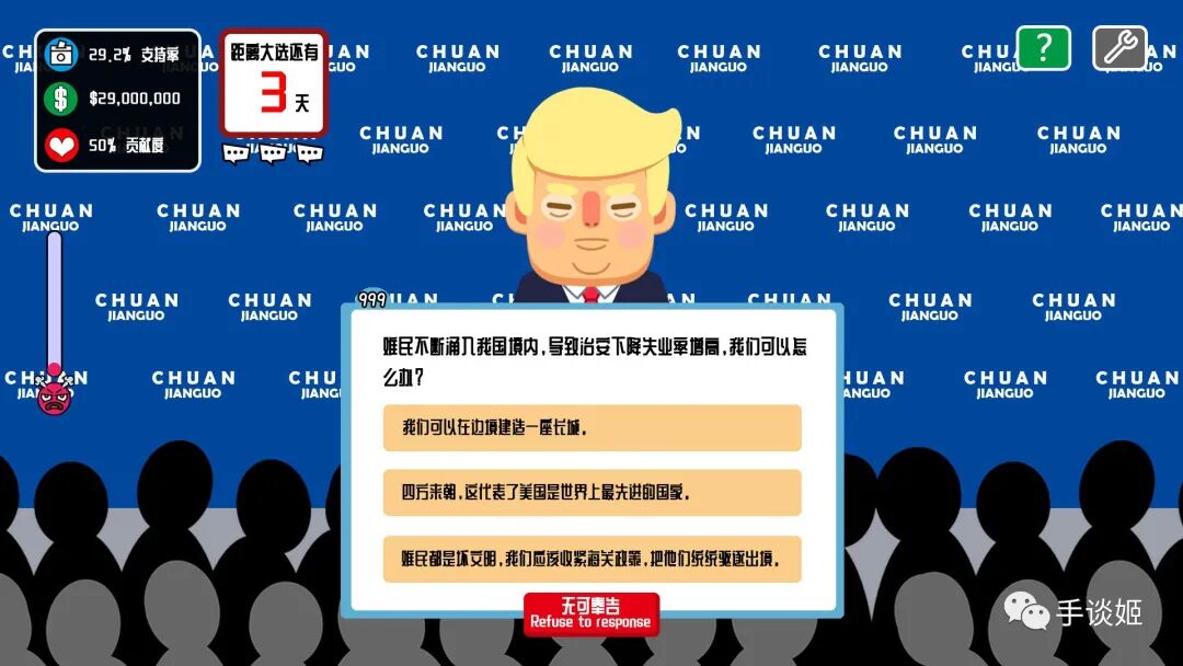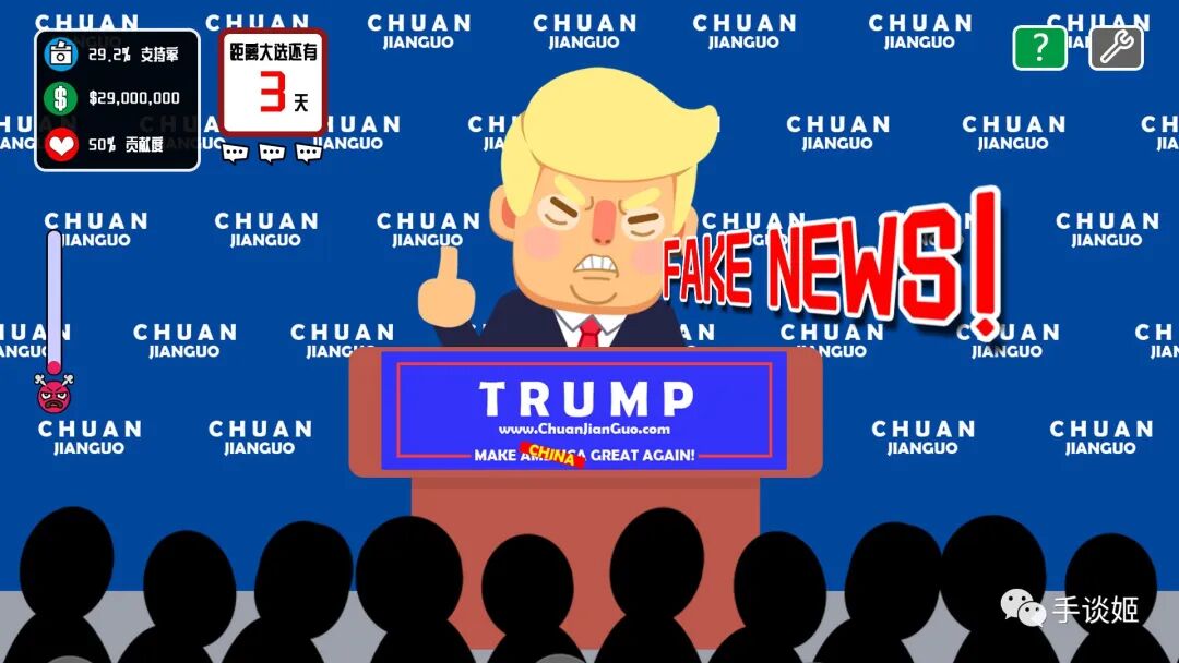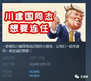 最近,手谈姬就在steam上看到了一款奇葩国产游戏,名字明显在玩辉夜梗的《川建国同志想要连任》(Comrade Trump's Re-election)。