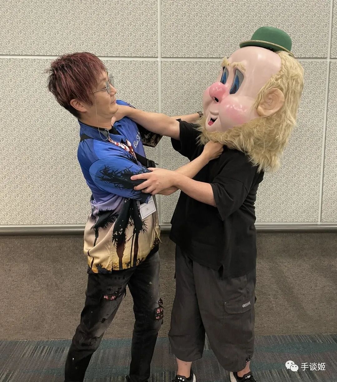在美国漫展上,小高和刚和横尾太郎相互拥抱。