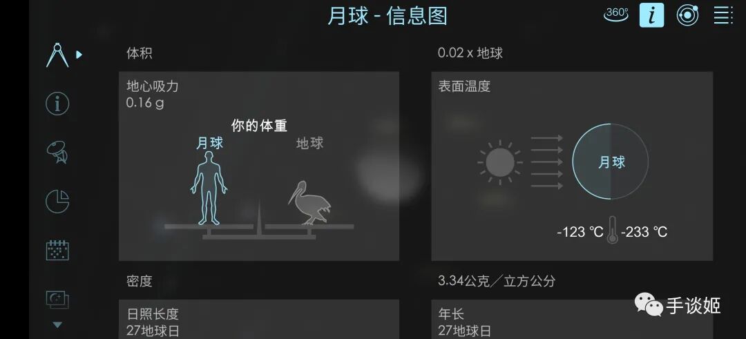 也能看到有关星球的一些常识性知识,像月球引力,体积,表面温度等;
