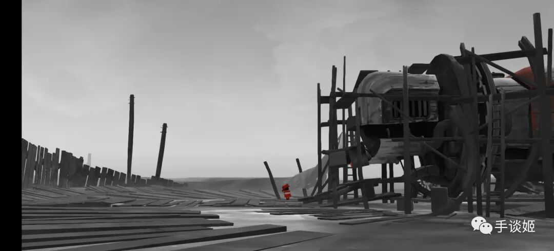 黑与白交织的天空和大地,猩红的主人公,残缺破败的建筑物,稀稀落落的动物,以及沉船船、废弃桥梁、无人灯塔等工业产物,无不提醒我们,这个世界或许遭遇了什么大变故。