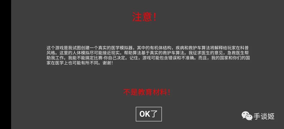 本作由俄罗斯游戏团队开发,开篇就提醒了大家,虽然游戏参考了医生们的专业意见,但终究只是游戏,可能有错误与不准确之处,可能每个国家的状况不同。