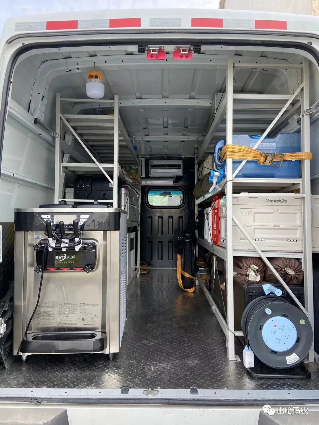 他的这个一位车是一个货车版本来说是买来露营的,考虑到改装幅度比较大会拉一些经常露营的用品,所以整个车的后尾箱全部是货架