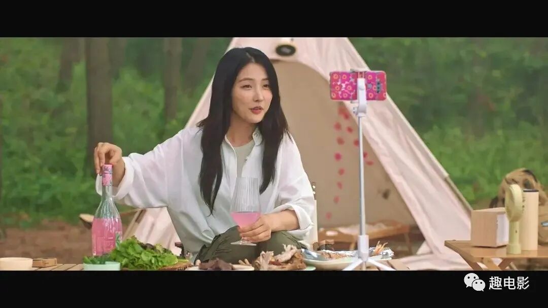 开场就是一个女网红的直播现场,女孩直播的内容是自己在大自然里生火、做饭、吃饭,类似于韩版李子柒。