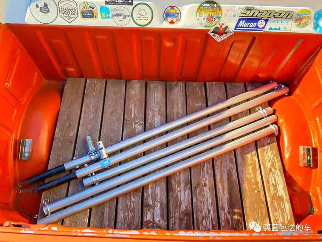 在后轮内叶子板上增设的吊架底座,吊架折叠后可以放入后尾箱内,将尾箱旧木板翻新继续使用,保持复古味道。