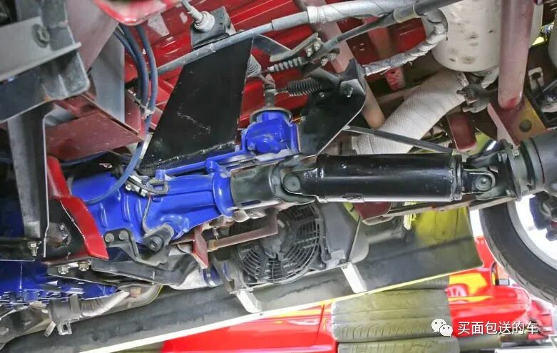 改装AE86的后传动轴和后整体桥,(注意侧裙上用电风扇强制冷却的进气中冷器)。