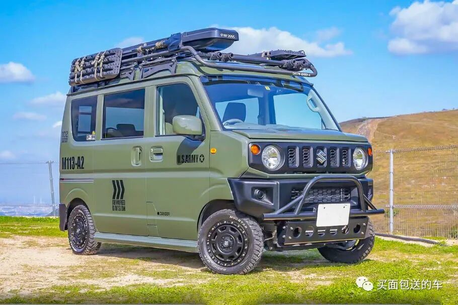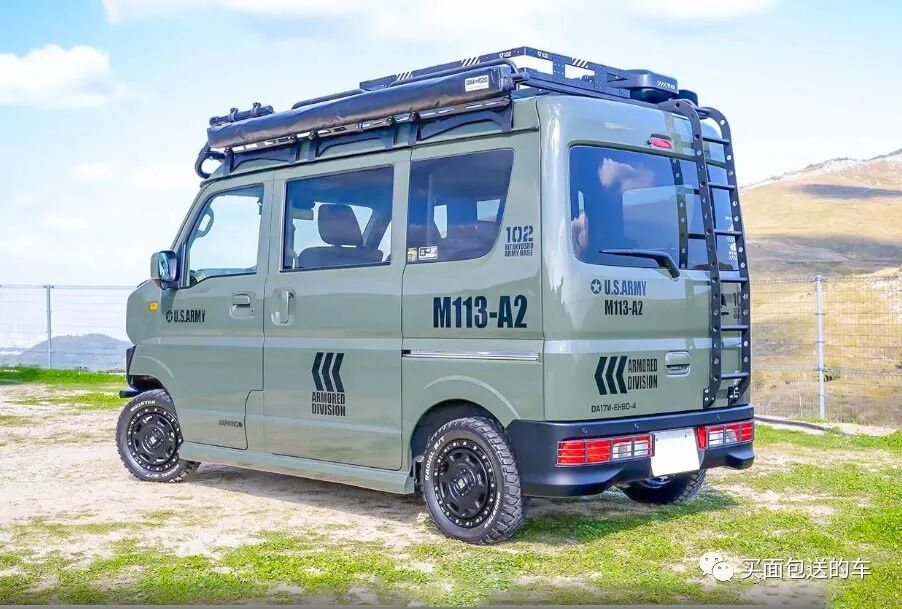 加装后尾门梯,车顶行李架,车边帐篷和军事风格的车贴