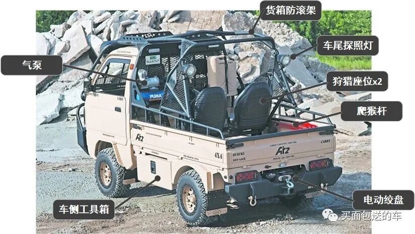 托尼.阿苏亚对这辆铃木轻卡的定位是狩猎用车,携带的装备物资能够满足3~5天的户外活动,在户外也可使用工具搭建现场的营地。