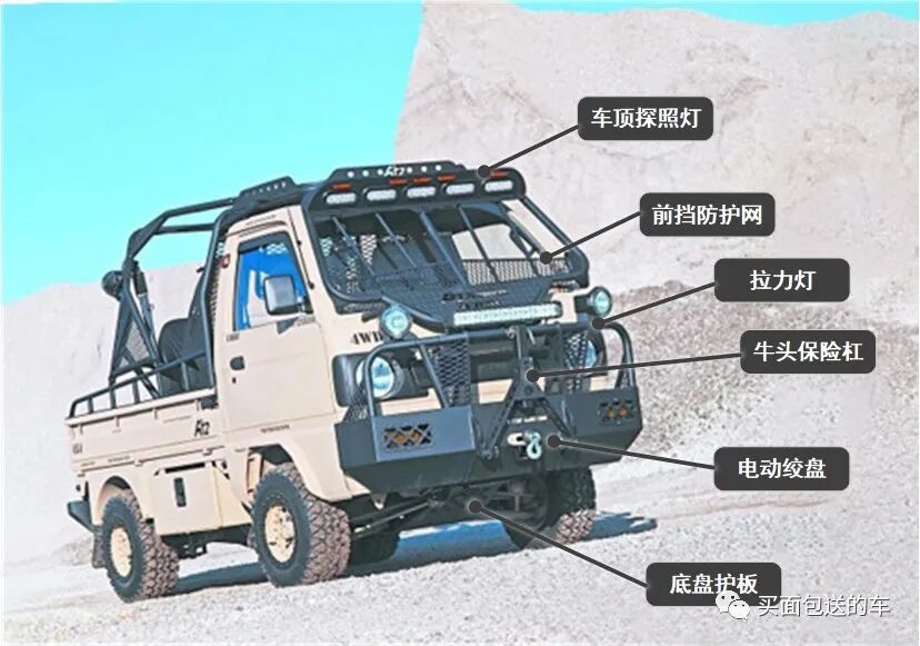 在车头位置加装了外骨骼般的牛头防撞杆和前档防护网,这种设计来至于澳大利亚的ARB,能将障碍物推至车的两侧,也能在丛林环境中避免树枝的羁绊。