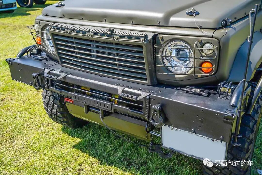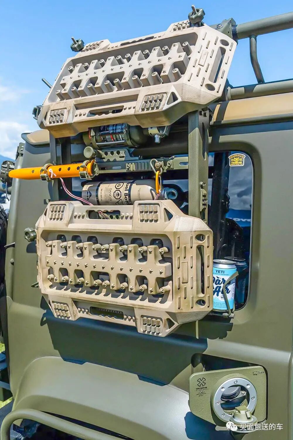 小窗上增加了车梯置物架,外挂两个脱困砂板以及户外水壶,油箱盖用法兰制作了圆形的玻璃窗盖。
