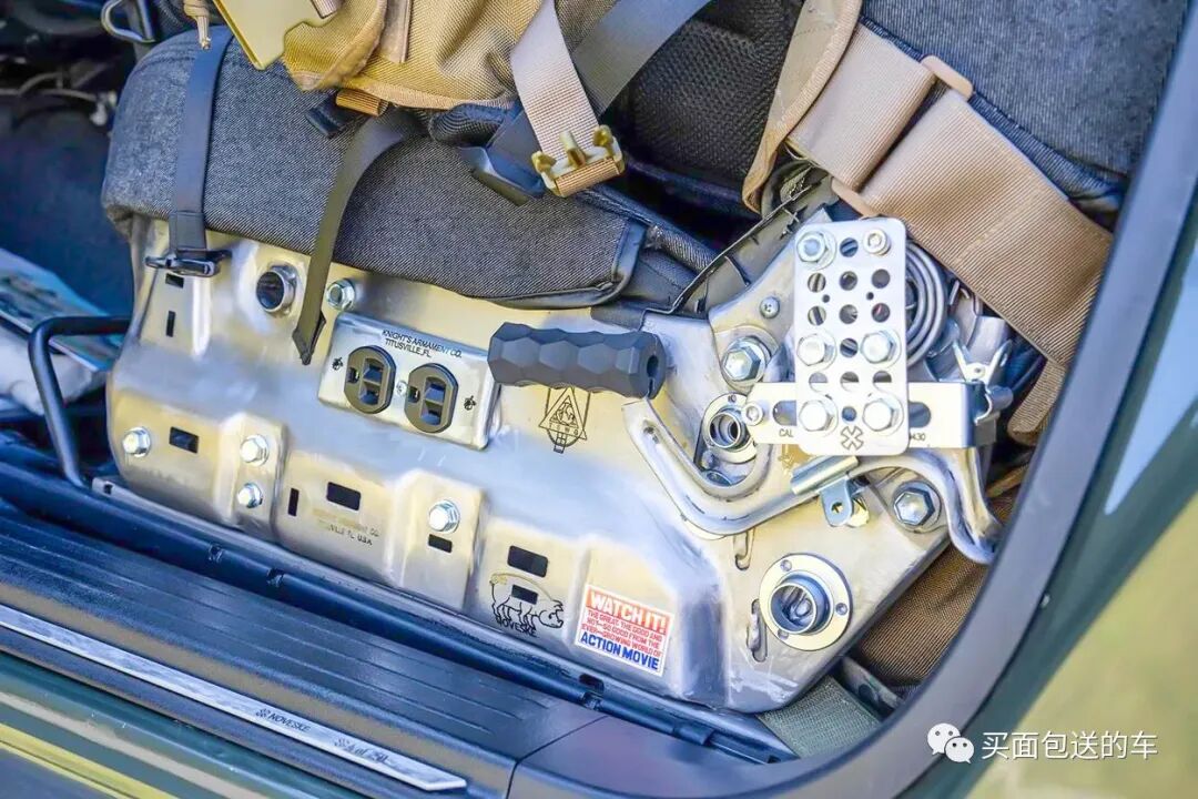 在仪表台上,融合了皮卡丁尼战术导轨以及MOLLE装具,中控台加高容纳独立的车机,手套箱下与A柱添加额外的音响单元。
