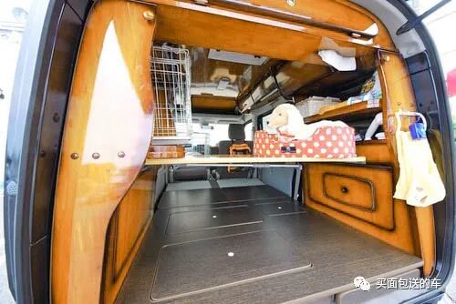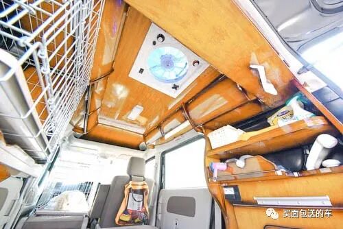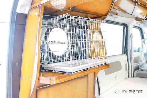 为了在车内饲养中型犬,副驾驶侧的D柱小车窗改装为半开式结构,为组合柜体上的宠物笼子实现了通风处理。