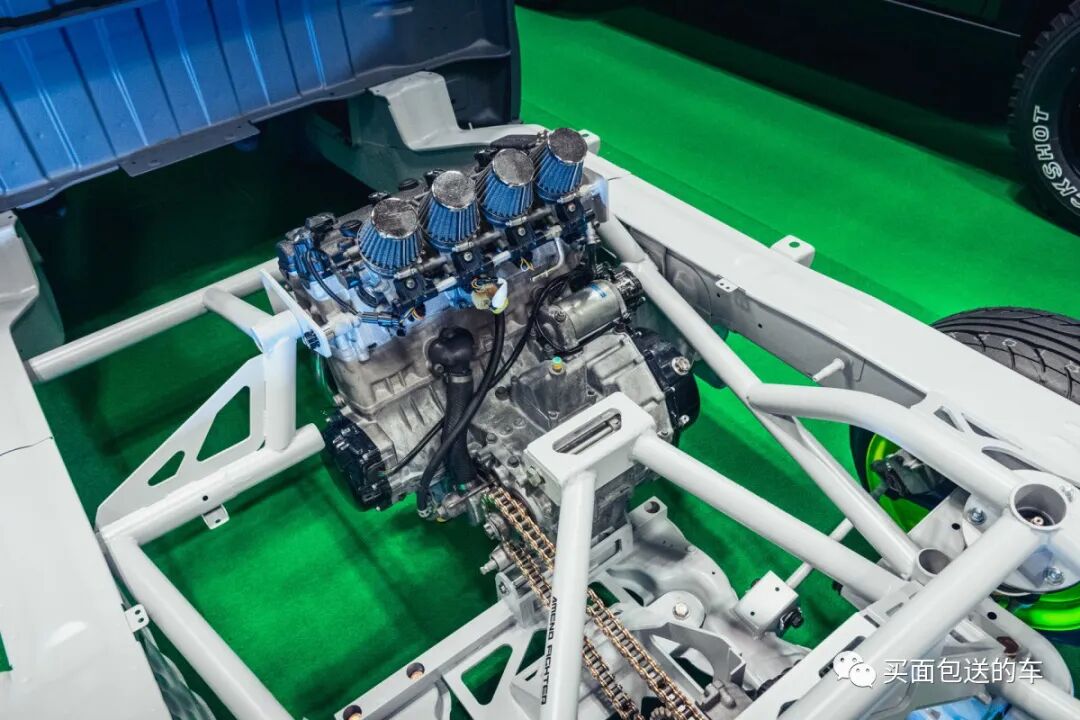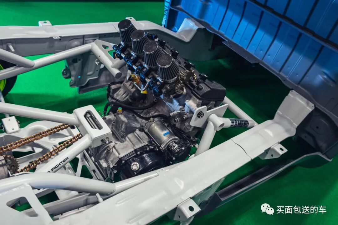发动机的姿态和摩托车一样,排气管在前方,并通过改装的不锈钢排气歧管引入到车后。
