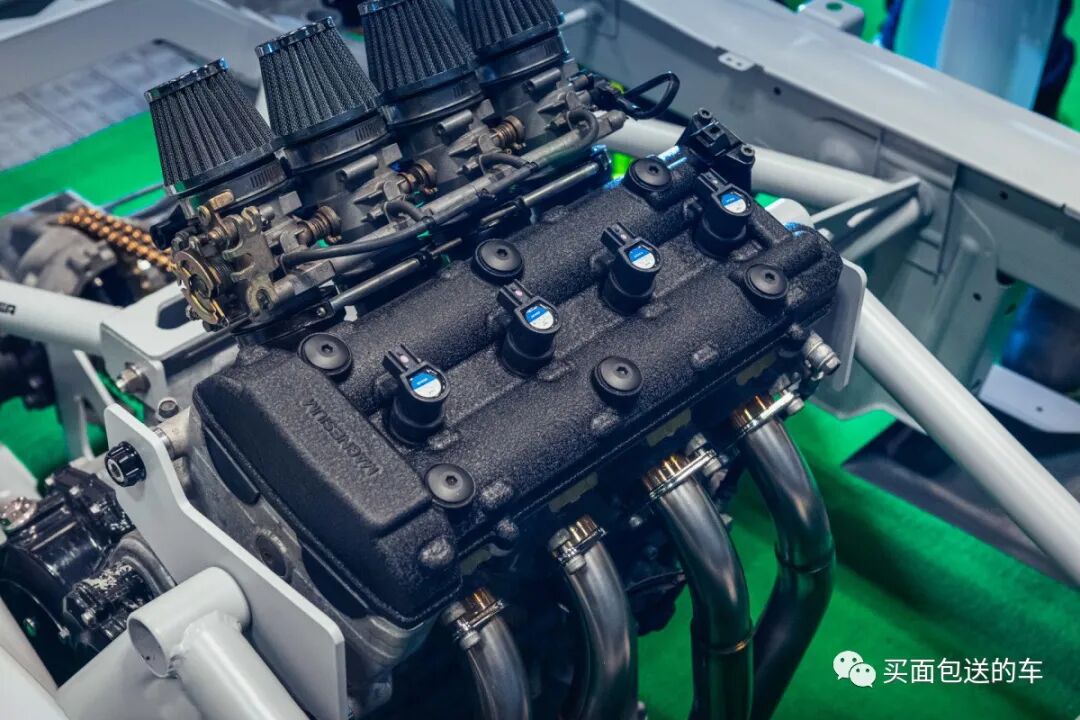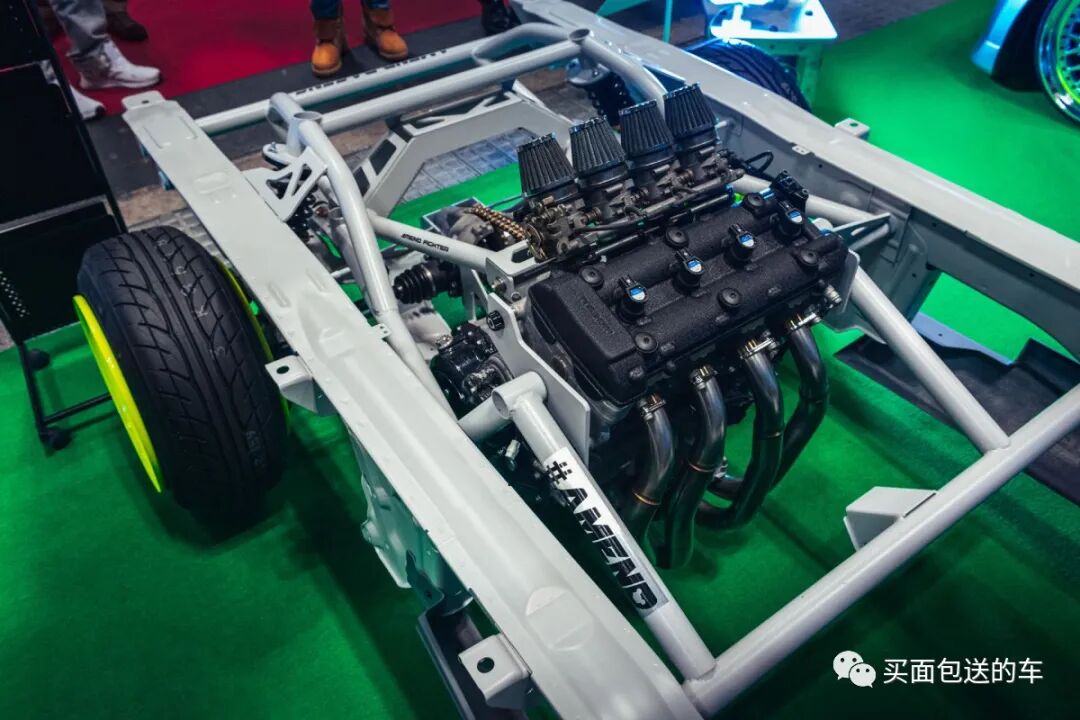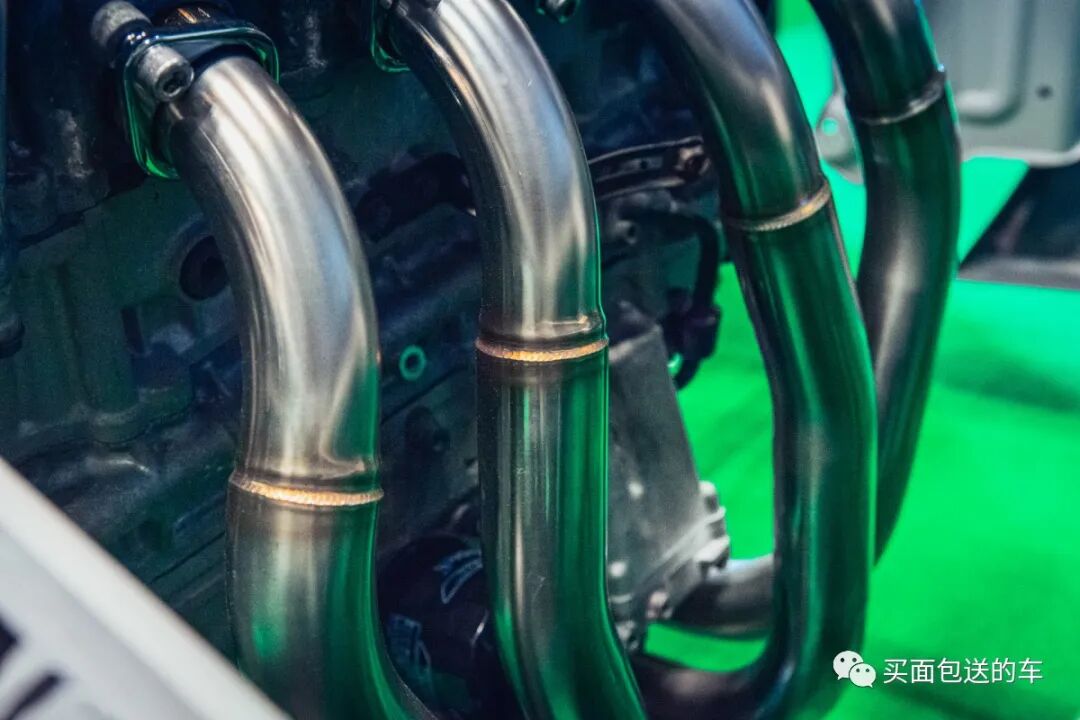 展示车上拆除了点火线,并且露出了机械拉线油门,气门室缸盖做了喷塑涂层,去掉进气歧管后,每个进气口单独接上高流量进气空滤。