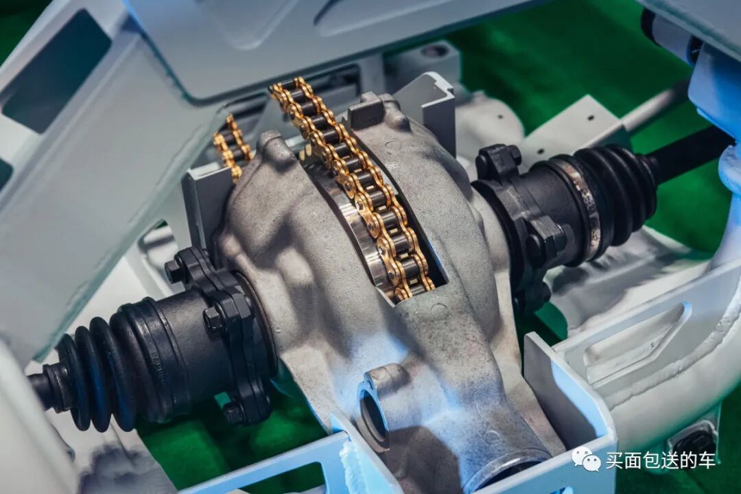 SUZUKI CARRY原车的后轮硬桥被左右半轴和独立悬挂所取代,通过切割差速器的外壳体,摩托车链条直接驱动差速器(这个连接的改装方式很有想象力)。
