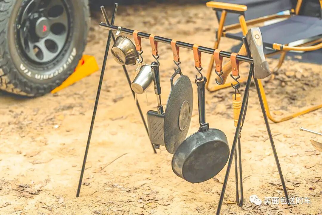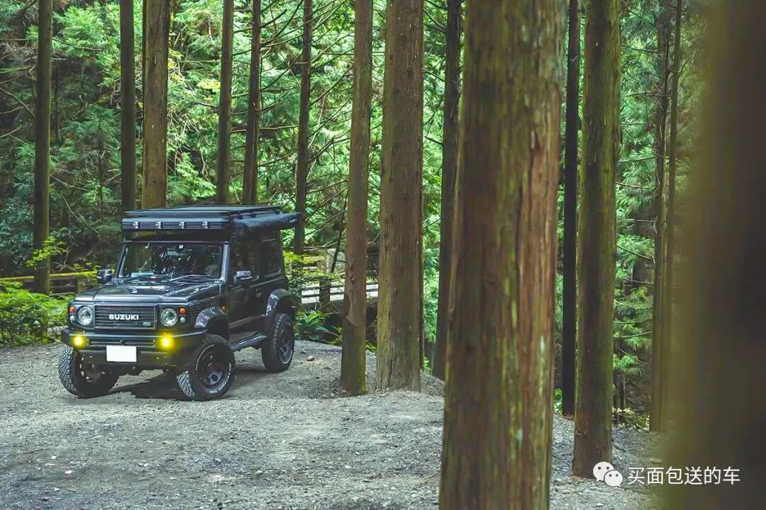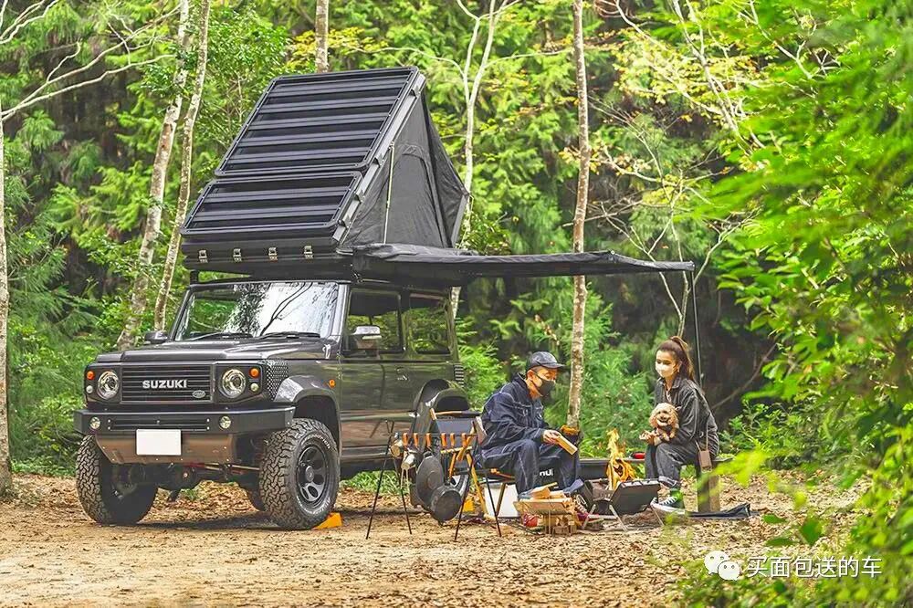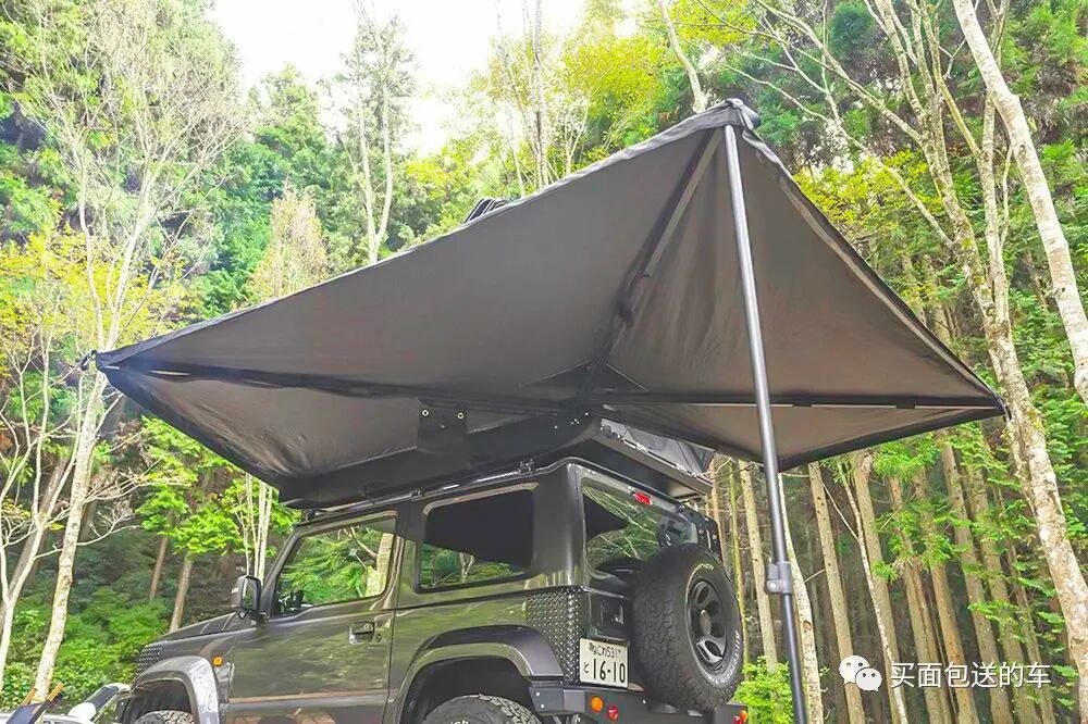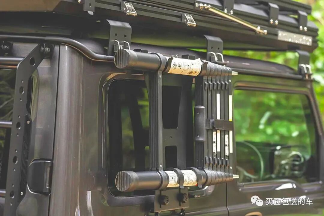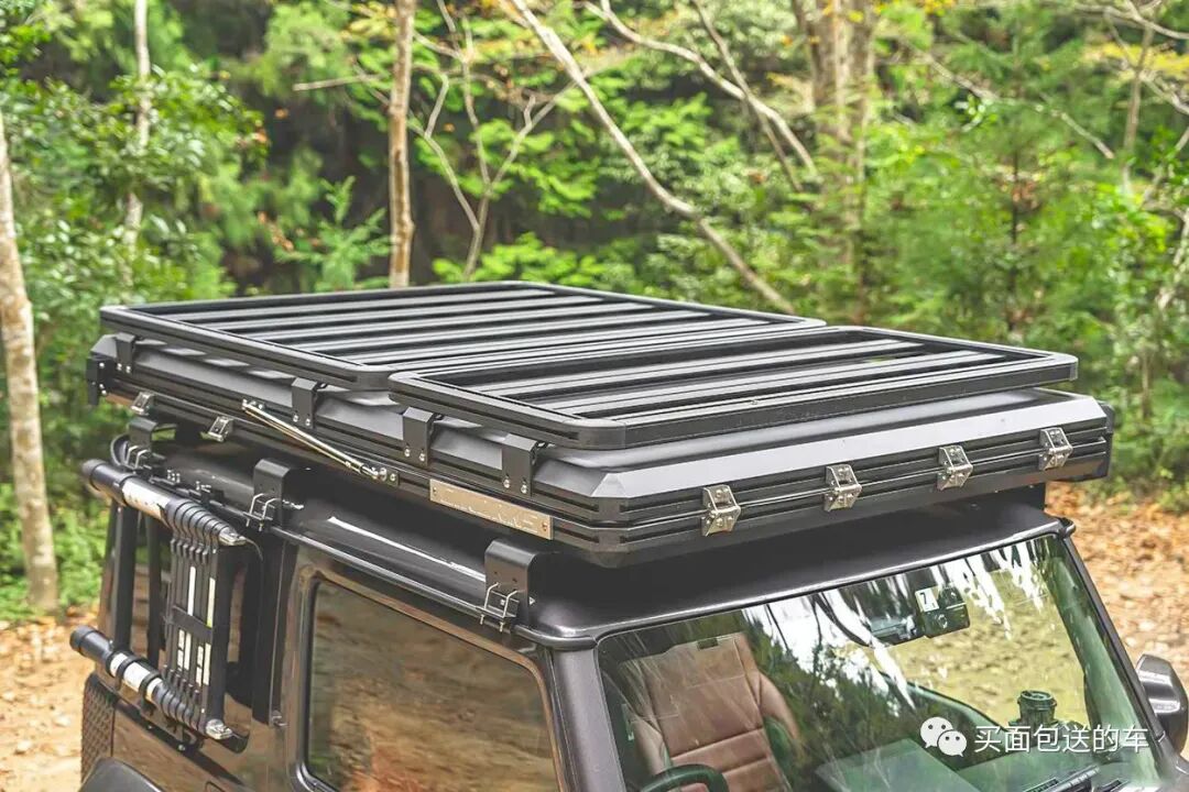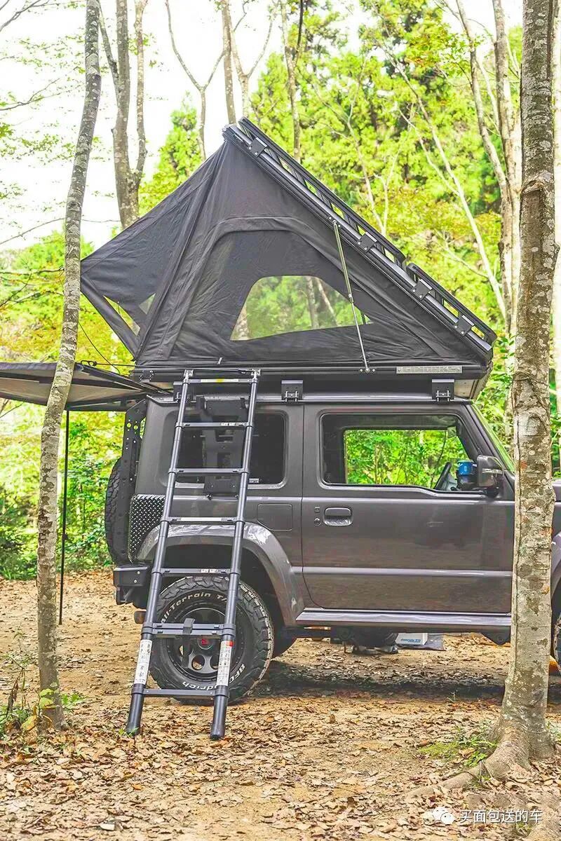 鉴于吉姆尼狭小的车内空间,车顶加装了GI WORKS 硬顶折叠帐篷,这款产品在帐篷的硬顶上部依然有型材导轨支持拓展安装户外装备。