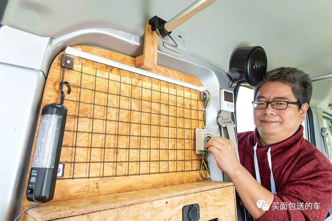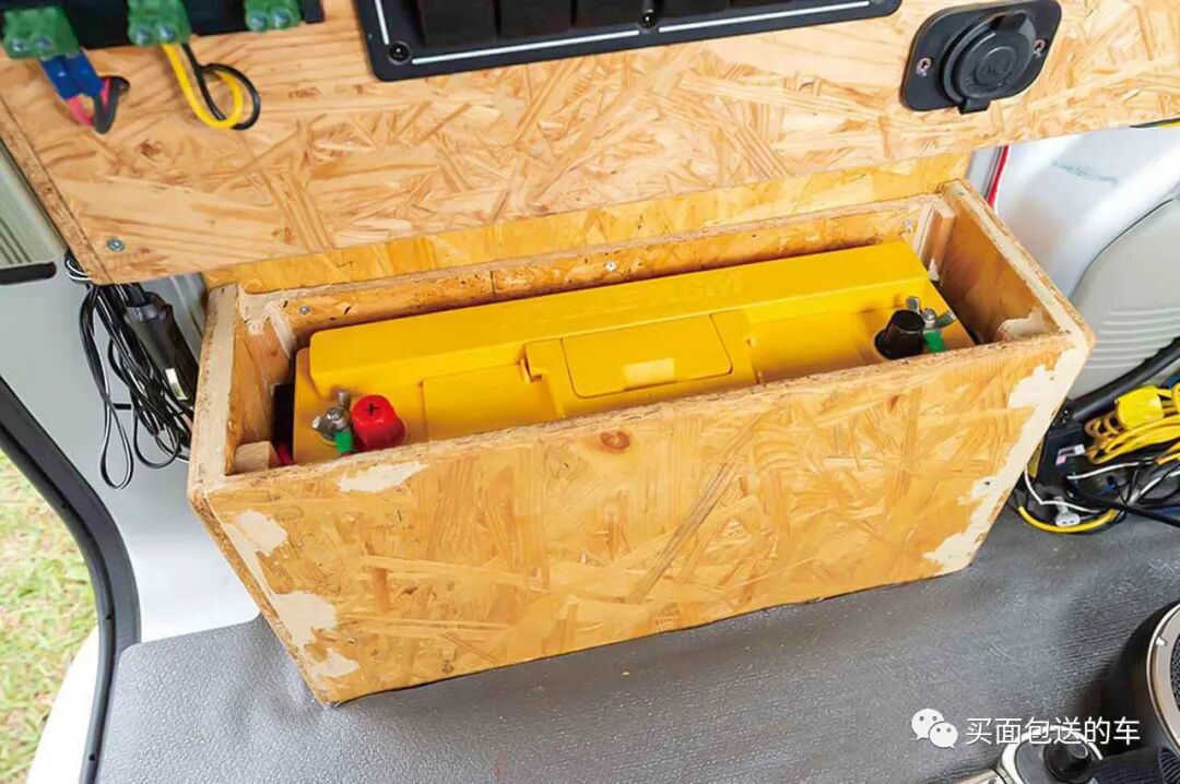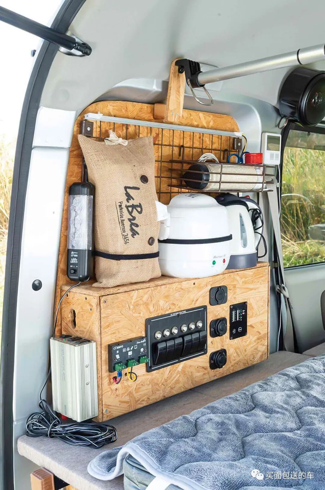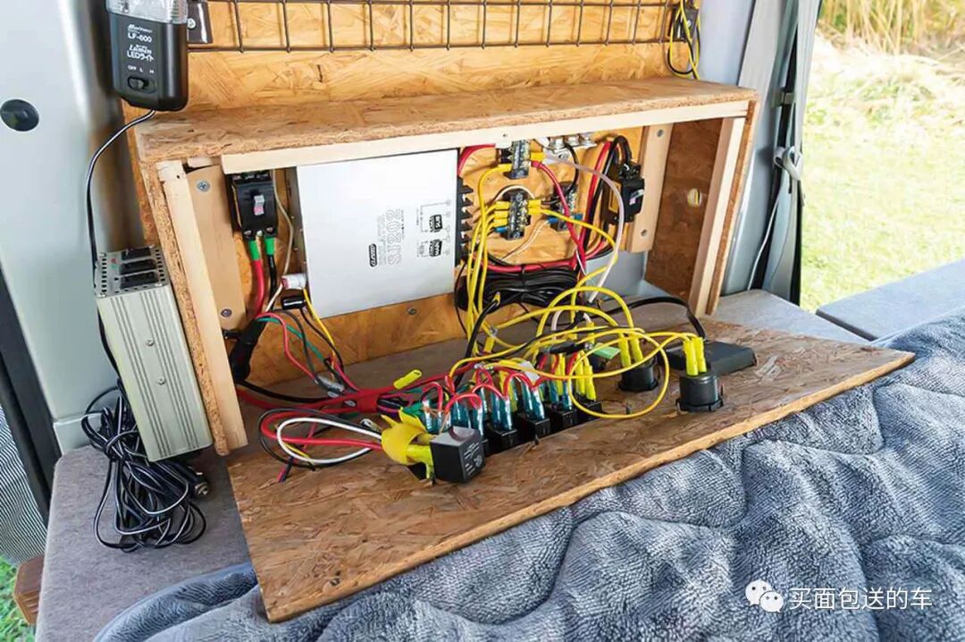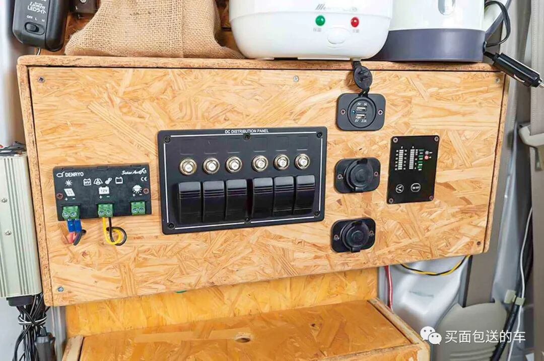面板打开后的样子,荻原先生用标准的电器模块控制驻车电源设备,这个系统和汽车的原车电路隔离开,并带有独立的电气保险盒,不会因为过度用电而影响发动机打火启动。