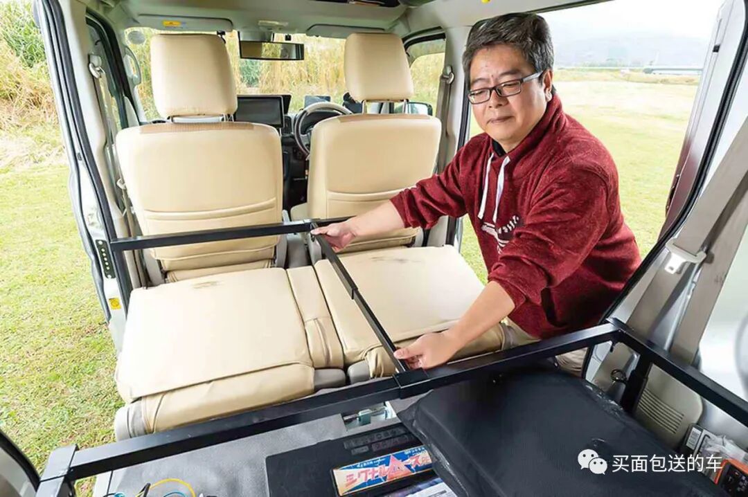 第三排平时是折叠状态,使用一个折叠碳钢支架在座椅靠背上方搭建一个平台。