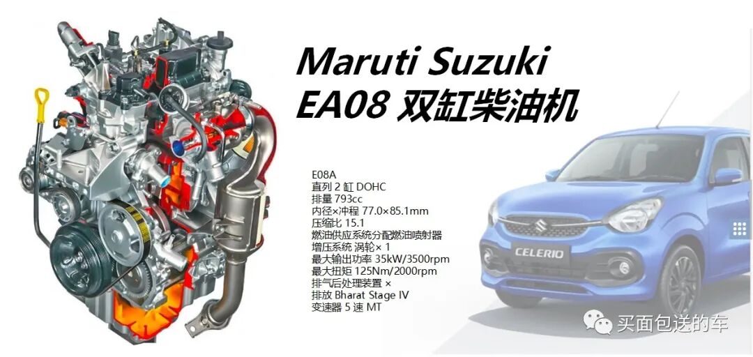 最后得到就是史无前例的,可用于轻型车上的0.8L直列双缸柴油机,相对于传统的汽油发动机,这台E08A微型柴油发动机的扭矩优势是压倒性的,如果变速箱和车架足够结实,印度铃木CELERIO还可以兼职客串一下拖拉机。