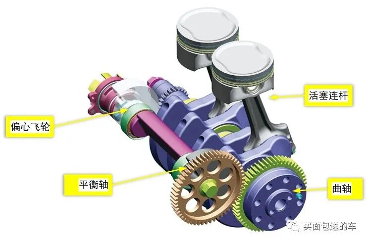 平衡轴上的偏心飞轮是双缸发动机特有的减震结构,也是其满足工作平顺性和动力连贯性的核心技术。