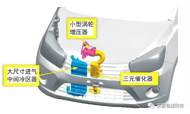 发动机进排气采用小型涡轮增压器(粉红色部分)和大型进气中间冷却器(蓝色部分),在低转速范围内实现高扭矩和燃油经济性。
