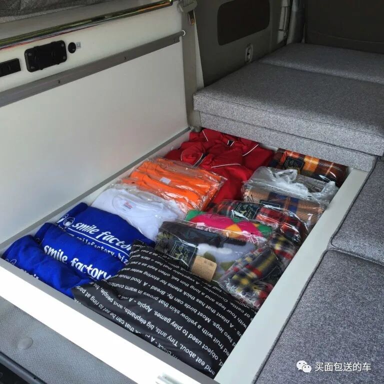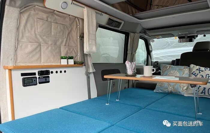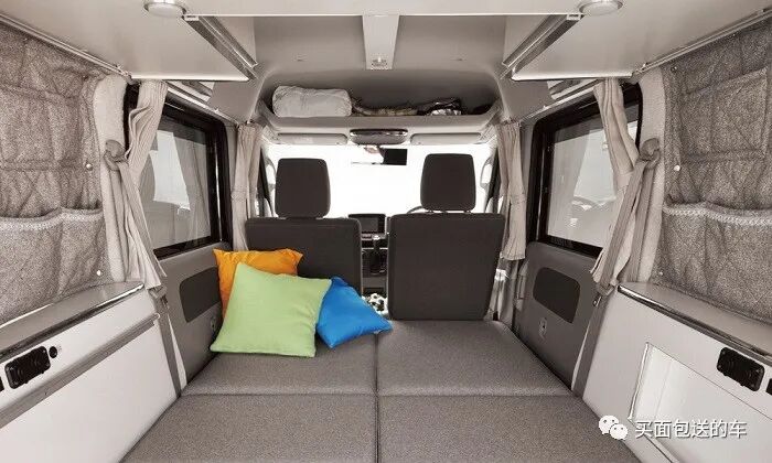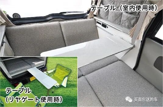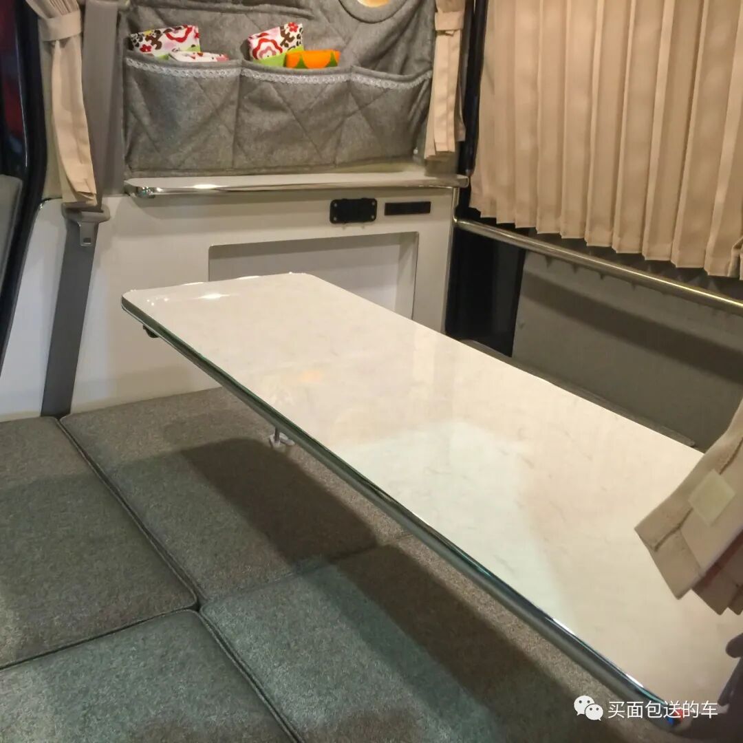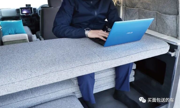 选装件也包括在车窗位置搭建中间层,除了放置收纳行李外,也可以作为办公桌板。
