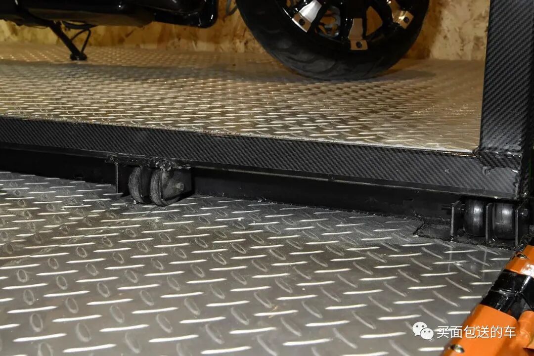 门板背面铺设了防滑纹理的不锈钢,方便单车或是大尺寸货物上下移动,拓展舱展开后,车宽度从1450mm增加到2900mm,拓展舱用5个腿支撑来固定到地面。