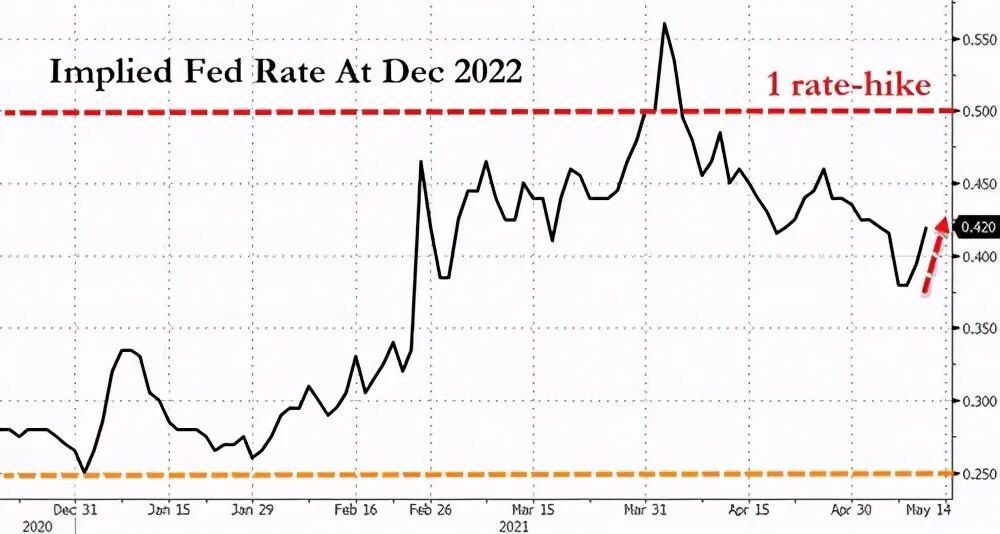 美国4月CPI创下2009年以来最大幅度的上涨,同比涨幅蹿升至4.2%,且涨幅超出预期,不仅于此,从各分项数据看,几个大类别基本上全部上涨,不含食品和能源成本的核心CPI指数环比上涨0.9%,为1982年以来最大涨幅,这也使得市场押注2022年12月之前加息的可能性正在上升到100%(具体趋势请参考下图)。