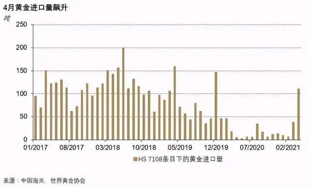 据中国黄金协会数据显示,截至4月,国内黄金类ETF持有量约72.4吨,创下历史新高。同时,中国市场黄金类产品的需求也同比大增212%,紧接着,海关数据显示,自2020年2月以来,平均每月进口黄金约10吨,2019年,每月进口量一度高达约为75吨。