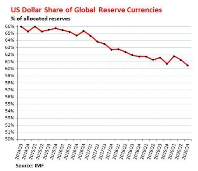 与此同时,据国际货币基金组织(IMF)的最新数据,截至2020年第三季度,全球央行(美联储除外)持有的以美元计价的外汇储备的全球份额(美国国债,美国公司债券,美国抵押贷款支持证券等)下降至60.5%。这是自1995年以来的最低水平。在过去的六年中,美元所占的份额以每年约1个百分点的速度下降: