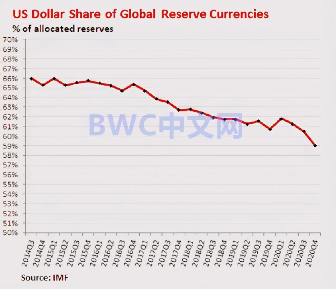 而推动美元市场这一通胀困境的,正是在过去63周内,美联储和美财政部已经总计印钞放水达30万亿美元的基础货币流动性(M1,M2,M3等)、资产负债表扩张、财政预算赤字和一揽子经济刺激方案。换言之,当巨量的美元被美联储毫无节制注入市场上以后,换来的代价正是美元在伤及自身的储备地位。据国际货币基金组织(IMF)数据,美元储备份额已经意外地从2000年时的73%下降至25年来最低至59%。