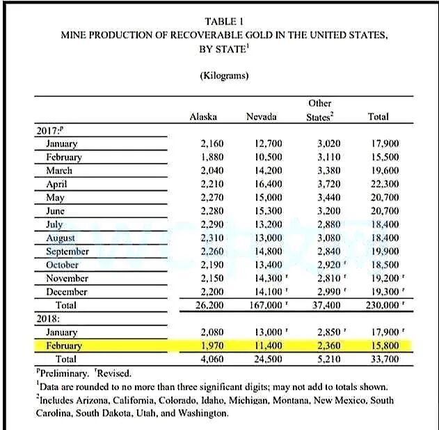 美国黄金开采量图片数据来源美国地质勘探局网站