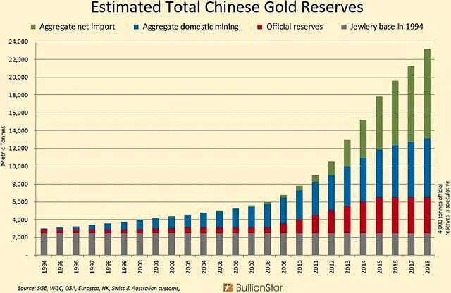研究机构估计1994年至2019年中国市场的黄金持有总量