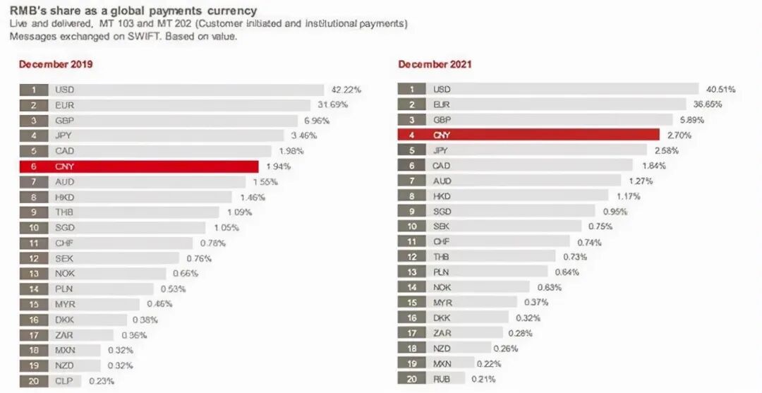 据环球银行金融电信协会(SWIFT)最新发布数据显示,2021年12月,人民币全球支付排名升至全球第四位。这也是人民币国际支付全球排名自2015年8月以来,首次超越日元升至第四位。