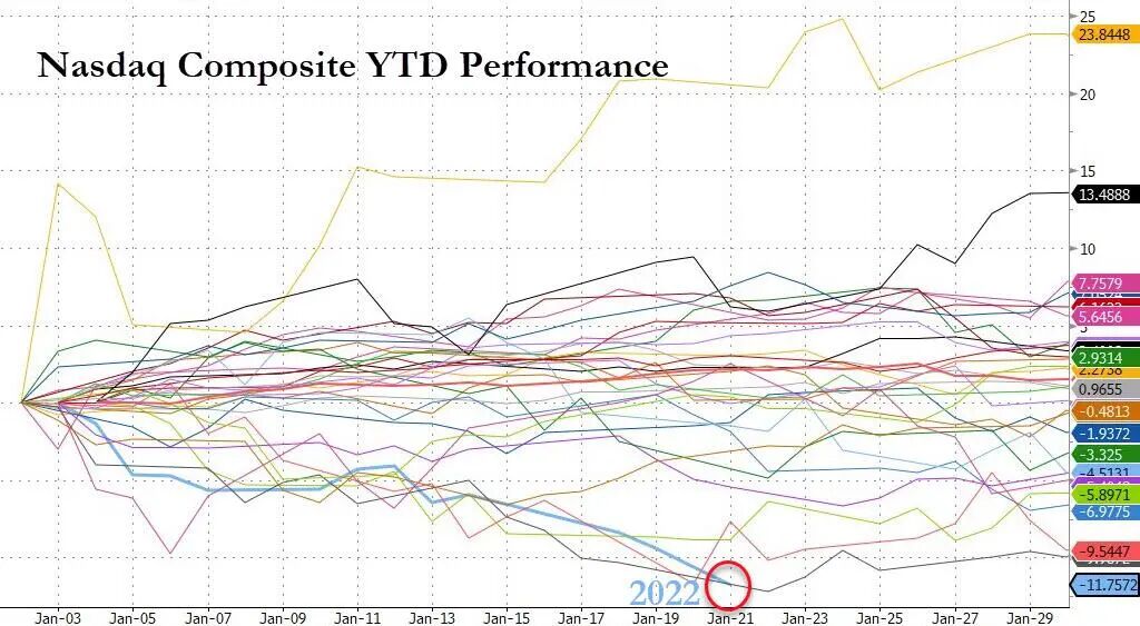 对此,美国银行在1月21日发表的报告中警告称,如果纳斯达克收于14,000 点以下,一切都将开始崩溃,紧接着,著名投资者、泡沫研究预测专家Jeremy Grantham也在1月20日对美媒CNBC表示,美国股市正进入他一年前所预测的历史性崩盘时刻,即便美联储干预也无法阻止最终近50%的暴跌,美股历史性崩盘已经开幕,正如下面的数据所示,纳斯达克现在正遭受至少30年来最糟糕的一年开局(比2008年略差)。