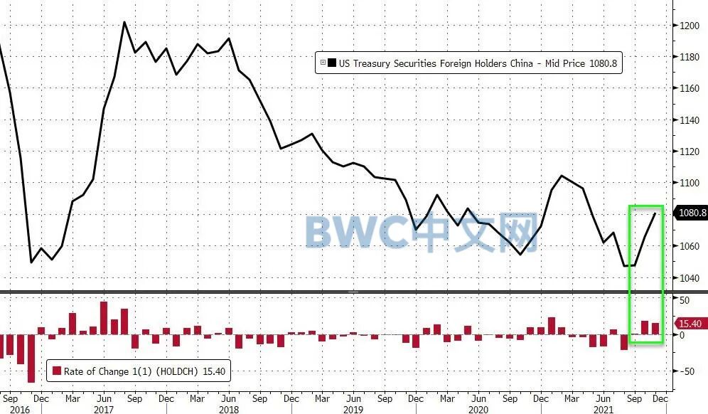 值得注意的是,美财政部的报告还显示,中国继2021年9月小幅增持6亿美债后,从去年10月份开始连续大幅度增持美债,中国连续三个月开始大幅增持了高达338亿的美债,在2021年10月和9月增持178亿和6亿后,在11月再次大幅增持了154亿美债,持仓创下去年4月以来新高至1.0808万亿美元,这也意味着,打破并且结束了此前大幅度减持的状态(具体趋势请参考下图)。