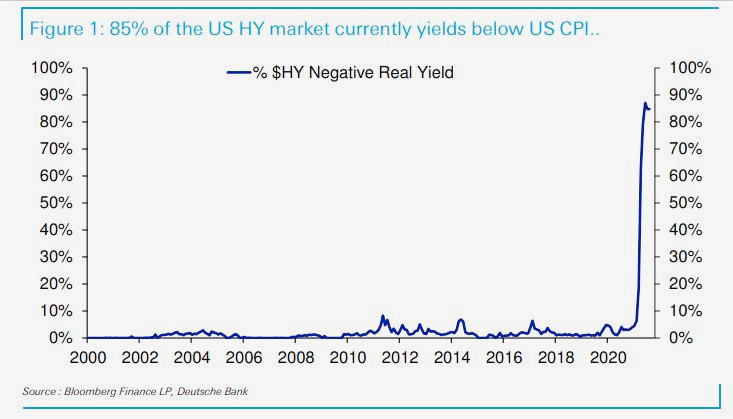 紧接着,德银高级分析师吉姆·里德在2月9日发表的更新报告认为,目前,含高收益率的垃圾债券在内的各期限美债产品中有高达85%的债券实际收益率为负值,远低于当前的通胀率。
