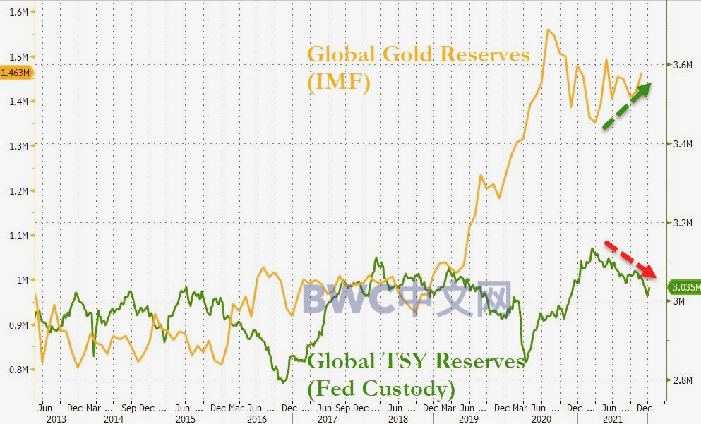 而最令市场担心的是,美债的最大的购买者美联储在今年3月后逐渐退出量化宽松并最终不再为美债买单,那么当初选择套利的投资者对美债的需求将会面临转向,比如黄金等战略性资产。下面这张由IMF和世界黄金协会为我们提供的数据显示,最近几个月从债券到黄金的置换趋势仍在继续。