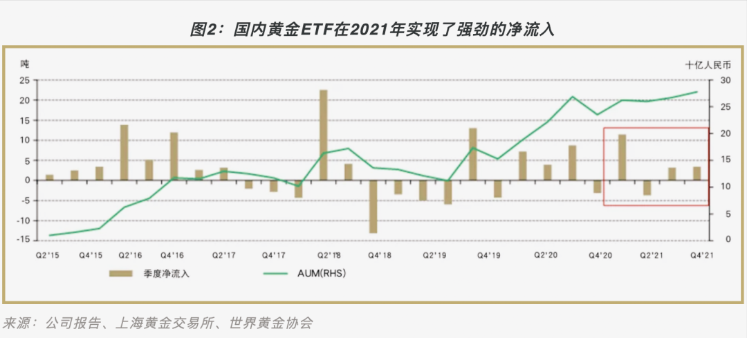 据世界黄金协会2月8日公布的最新报告,2021年,中国市场的金饰需求达到675吨,同比增长63%,比2019年高6%,2021年全球央行净买入黄金高达463吨,值得注意的是,亚洲黄金ETF总流入量的60%以上来自中国。