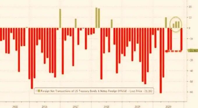 另一个迹象也已经出现,据美国财政部1月20日最新美债持仓报告,全球央行已经在过去的32个月中有27个月共净抛售了1.15万亿美债(具体数据趋势也请参考下图),据IMF在1月发布的报告,在2000年美元资产约占全球储备的70%,但到了2020年三季度这个数字已经降到了60.27%,如果这种趋势持续下去,将很容易在不久的将来看到跌至50%。