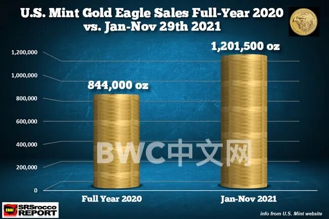 另据世界黄金协会在2月11日公布的数据显示,1月份美国鹰金币的销售量为18.15万盎司,在历年的1月份销售总量中排名第三,2021年以美国市场为代表的银币销量也创下历史新高,银币销量为1.477 亿盎司。根据美国铸币局在3月4日公布的数据,2022年1至2月,美国铸币局的金币销量就已经高达36.5万盎司,比2018年全年的出售数量(15.2万盎司)的两倍还要多,而去年的金币总销量高达120万盎司(自2009年以来最高的年度销售量),也远超2020年的84.5万盎司。(完)