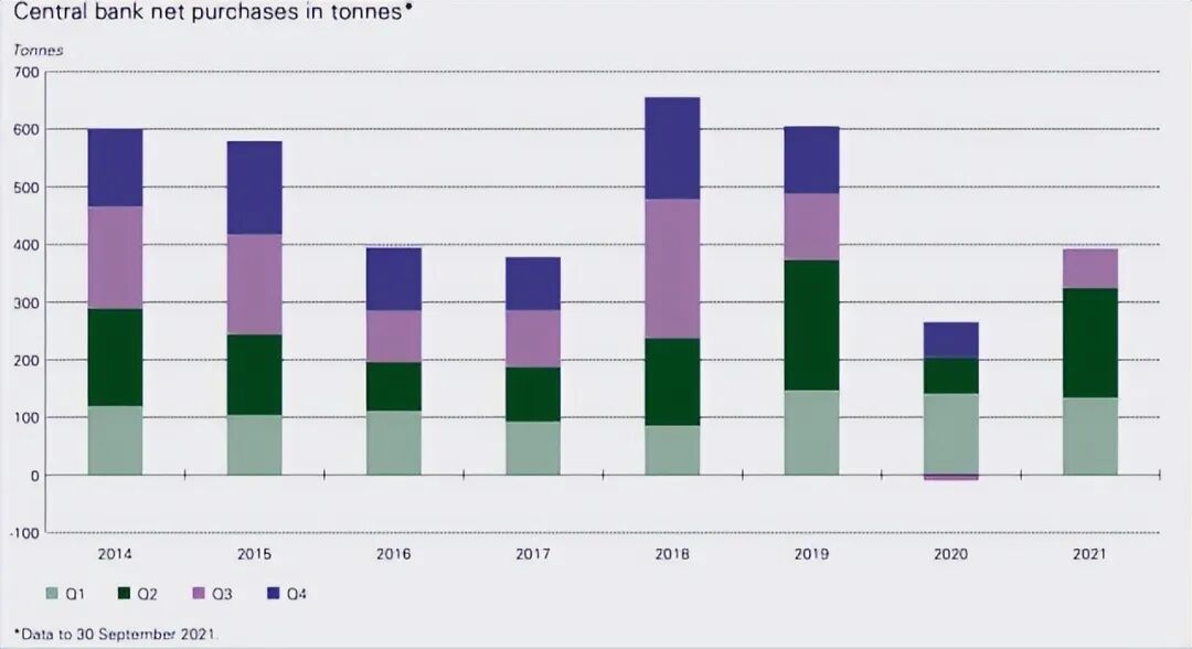 世界黄金协会在3月24日发表的报告中称,黄金可以作为全球央行有效且独特的流动性风险分散和对冲手段,超过21%的全球央行计划在接下去的两年内会继续购买黄金,而他们已经在去年购买463吨黄金,相比上一年增长82%,更比最近五年的平均水平高出39%,创下美元与黄金脱钩那年以来的最快购买速度纪录。