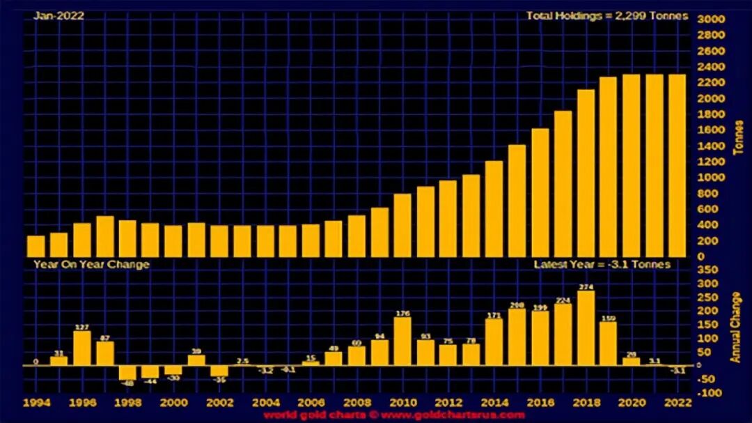 然而,据俄罗斯银行称,该国剩余的外汇储备,包括实物黄金,是安全的,据世界黄金协会和俄罗斯央行公布的数据显示,俄罗斯于2014年开始加大了黄金购买力度,自那时以来,俄罗斯的黄金储备量增加了一倍多,至2月1日,俄罗斯黄金储备为7390万盎司(约2300吨)。