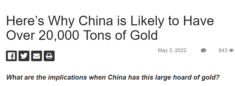 值得一提的是,如下图示,美媒Silverdoctor5月3日还称, Alasdair Macleod 根据有关分析认为,中国实际积累了超过 20,000吨黄金,比我们知道的数量多很多。而包括美国金融网站Zerohedge稍早前援引Simon Hunt战略服务公司首席执行官的一封信中称,中国实际或拥有3万吨黄金。此外,国际黄金分析第一人阿拉斯代尔麦克劳德也分析认为,中国在1982到2003年间贮积了2.5万吨黄金,而目前很有可能超过3.1万吨黄金。