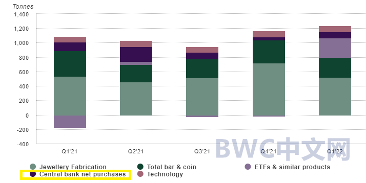 关于全球央行增加黄金储备的最新进展是,世界黄金协会公布的最新数据显示,2022年一季度全球央行官方黄金储备增加84吨,虽较去年同期减少29%,但净购金量环比增长一倍多。而在过去五年间,全球央行已经净购买了2390吨黄金。