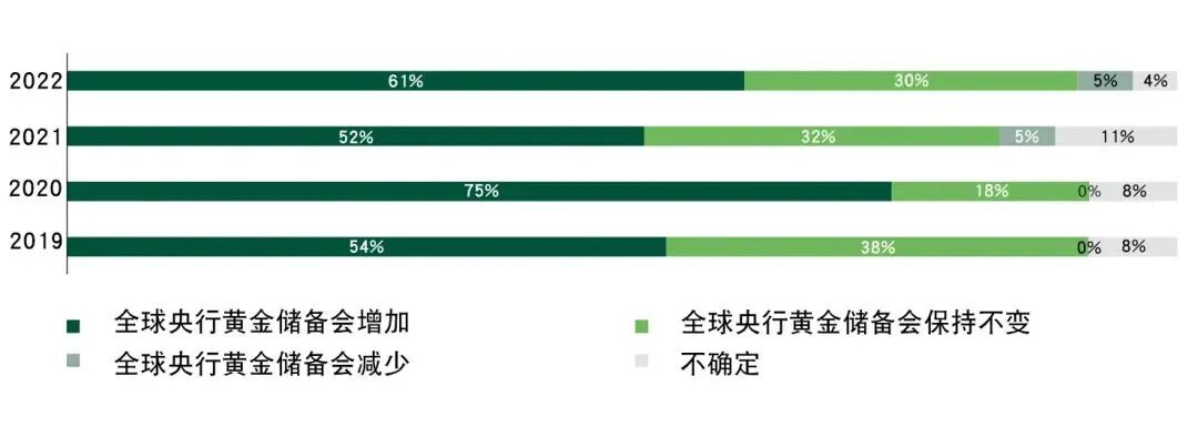 世界黄金协会在6月28日发布的全球央行黄金需求调查报告称,黄金的“无违约风险”以及作为“有效的投资组合风险分散工具”属性构成了影响他们购买黄金决策,全球央行越来越预期美元将会持续失去主要储备地位,61%的受访央行预计在未来12个月里全球央行将增储黄金,这一数字较2021年的52%有明显上升。