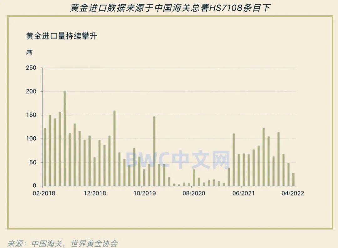 不仅美国人的黄金需求在增长,中国市场亦如此,据世界黄金协会和海关最新公布的数据,2022年1至4月,中国共进口黄金高达256吨(其中1月为113吨),2021年,中国共进口黄金818吨,比2020年增长了36%。