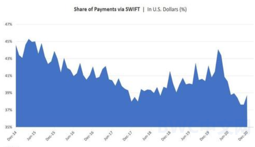 美国金融网站Zerohedge2月7分析报道称,随着多国逐步取消美元在全球经贸和金融方面的作用,美元作为储备货币的地位或正面临被取消。例如,欧盟委员会前不久在一份通讯中明确指出,加强“欧元的国际角色”的目标。与此同时,全球多国都在开展包括加密货币,以及以黄金为背书的数字货币的开发及使用。与此同时,全球最大的支付结算网络-全球银行间金融电信协会SWIFT在最近的报告中显示,美元交易最也正在减少。