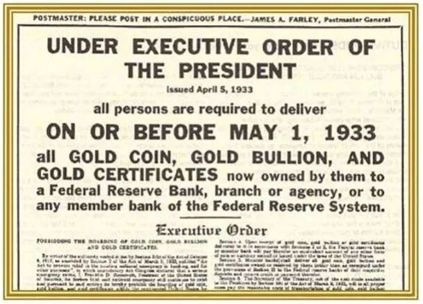 美国没收民众黄金的事件发生在1933年,当时出于种种原因,时任美总统罗斯福就通过了一份臭名昭著的行政命令,长话短说,美国人被要求上交他们的黄金,作为回报,他们将在银行存入一笔存款(细节请参考下图)。而按现在的市场消息来看,显然美国民众有了这种担忧。目前,美国人正在抢购和囤积金币。