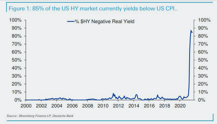 这也意味着美国实际联邦基金利率经通胀调整后变为负5.6%,正如下图所示,这个数值是1954年以来跌幅最大的时候,甚至,大多数高回报价值的企业债券的收益率也远低于通胀值,这就意味着美国债券投资者要为此承担更多的风险,从理论上说,存在倒贴利息费用的可能。